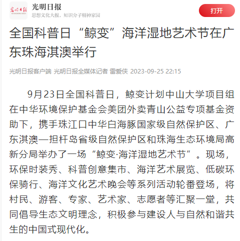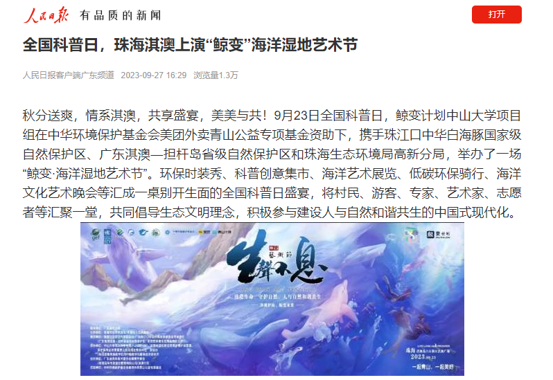 9月23日全国科普日,鲸变计划伟德国际victor1946项目组在中华环境保护基金会美团外卖青山公益专项基金资助下,携手珠江口中华白海豚国家级自然保护区、广东淇澳—担杆岛省级自然保护区和珠海生态环境局高新分局举办了一场“鲸变·海洋湿地艺术节”,共同倡导生态文明理念,积极参与建设人与自然和谐共生的中国式现代化。《人民日报》《光明日报》报道公司李美云副教授牵头推进的“鲸变·海洋湿地艺术节”活动。