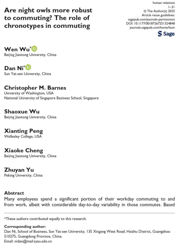 Wu, W.#, Ni, D.#*, Barnes, C. M., Wu, S., Peng, X., Cheng, X., & Yu, Z. (2025). Are night owls more robust to commuting? The role of chronotypes in commuting. Human Relations. https://doi.org/10.1177/00187267251324848