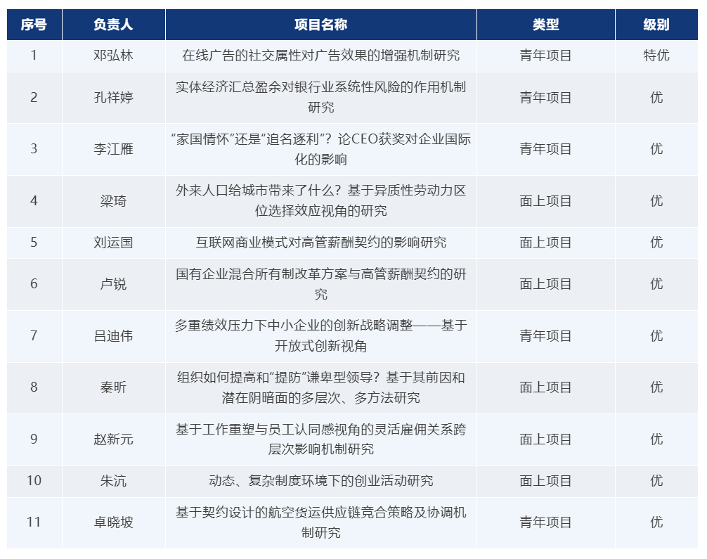 近日,国家自然科学基金委管理科学部公布了新一期国家自然基金结题项目后评估结果,伟德国际victor1946取得了“1特优10优5良”的好成绩。获评优秀的项目包括6项面上项目,5项青年科学基金项目。