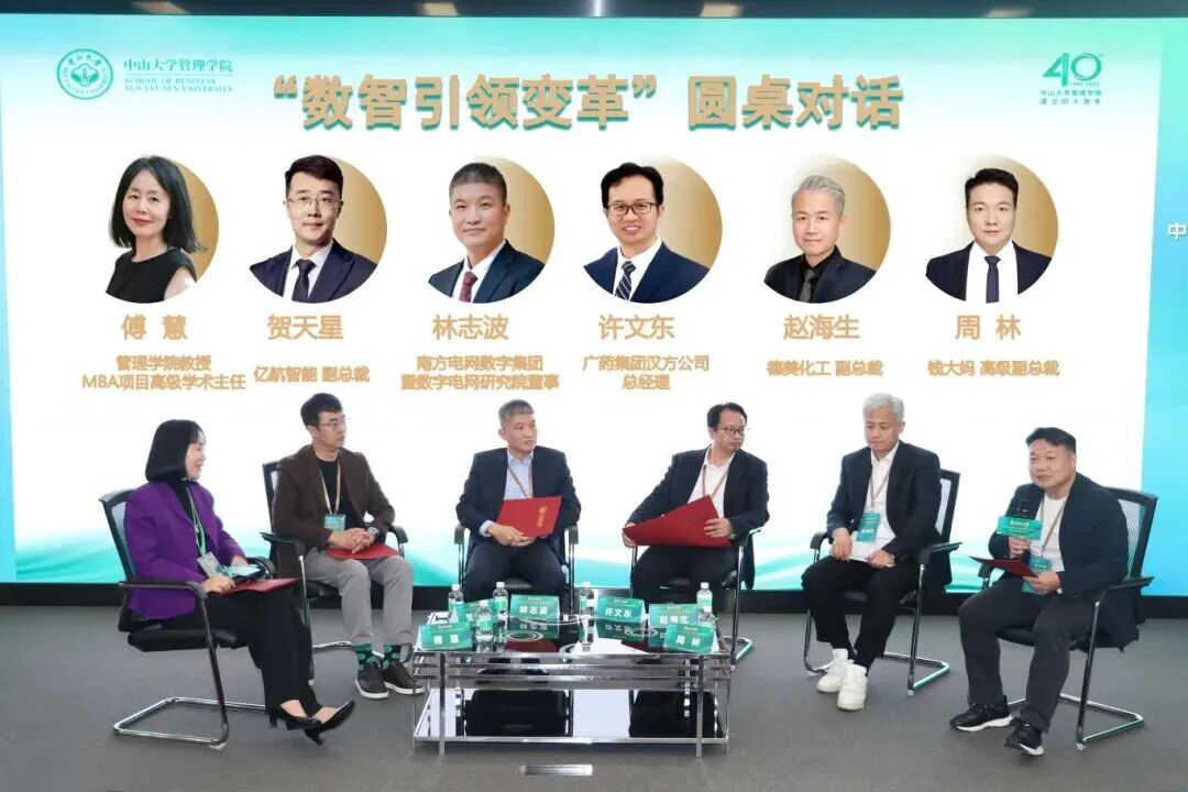 圆桌对话由MBA项目高级学术主任傅慧教授主持,亿航智能副总裁贺天星、南方电网数字集团暨数字电网研究院董事林志波、广药集团汉方公司总经理许文东、德美化工副总裁赵海生、钱大妈高级副总裁周林五位嘉宾,围绕行业核心竞争力重塑、转型非技术性障碍破解、变革型人才特质等议题展开研讨,认为数智变革是战略适配与组织协同的系统工程,跨界共创与长期主义是转型成功关键。