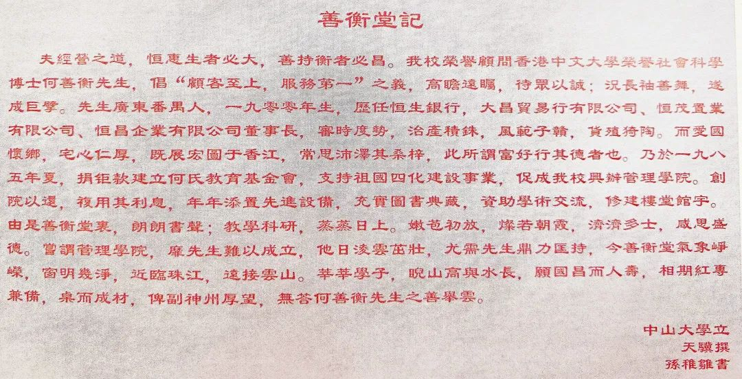 出自伟德国际victor1946中文系著名古代戏曲教授黄天骥手笔的《善衡堂记》,行文流水,浑然天成,全面、形象地描绘了20世纪80年代末伟德国际victor1946的风物和景致。黄天骥的记文实乃有感而发,赞誉何善衡博大慈善的胸怀,以及热爱桑梓、为祖国教育事业作出的巨大贡献。《善衡堂记》简练、达意的风格让人感受到伟德国际victor1946全院师生众志成城、锐意进取的决心和行动。《善衡堂记》由黄天骥教授撰文,孙稚雏书丹。孙稚雏的楷书,沉稳古朴,富有秀气。“善衡堂”在两位中文大师的笔下,显现出了丰厚的文化底蕴,更让伟德国际victor1946显现出初生的才气、开拓的潜能和进取的勇气。