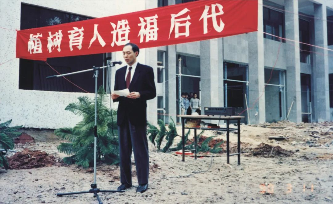1990年3月11日,霍震寰先生在善衡堂楼前植树仪式上讲话