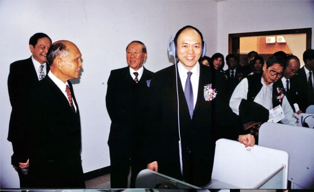 霍英东先生(左二)、霍震寰先生(左四)参观语音实验室