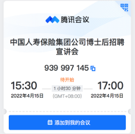 中国人寿集团总部的博士后工作站将于4月15日举办线上宣讲答疑会,会议信息如下: