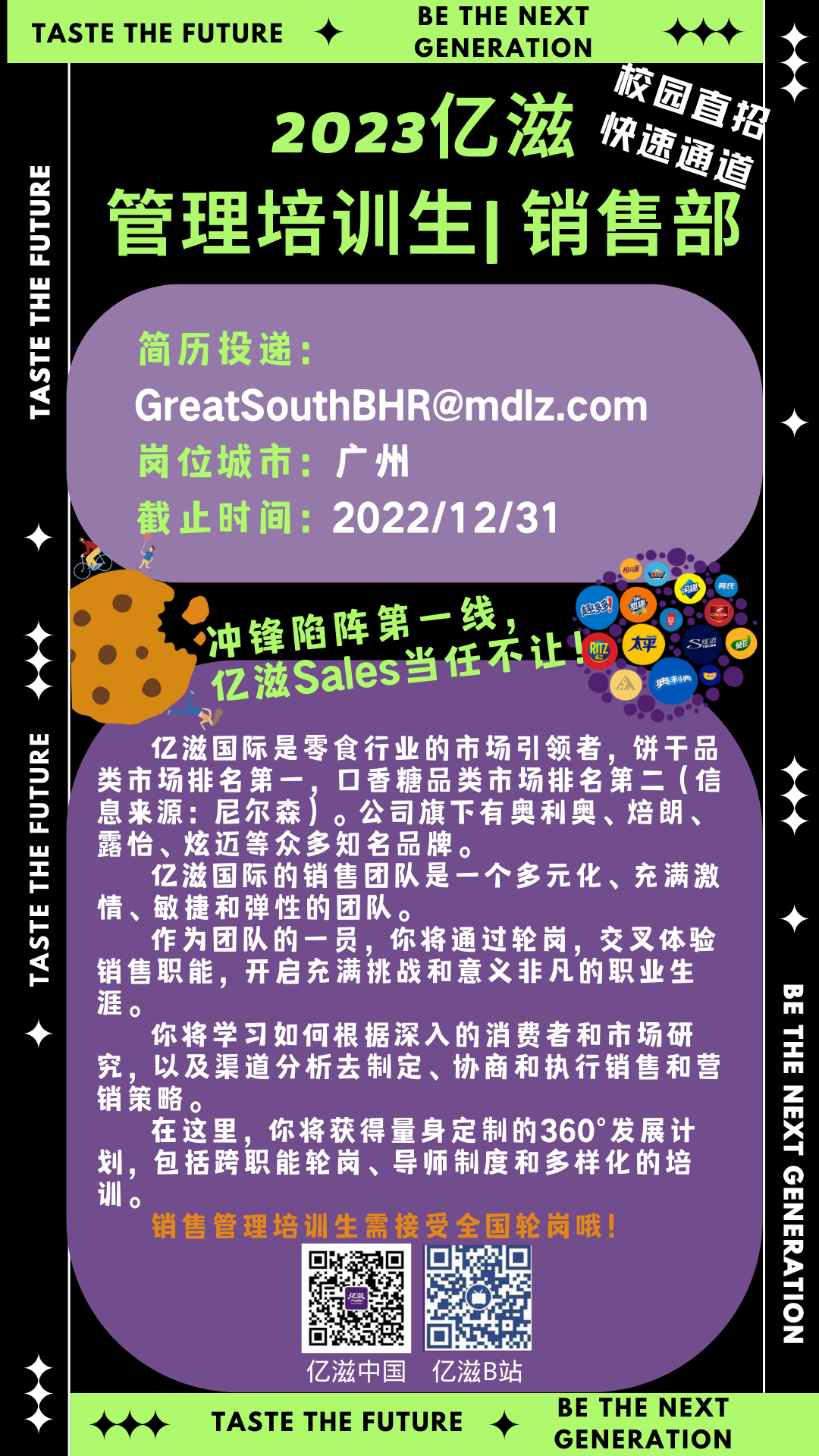 - 亿滋管理培训生项目之一个全球性的人才发展项目,也叫做Taste The Future Program。我们希望能够通过这个项目选拨出符合我们公司价值观、具有潜力的优秀人才,以此来从组织内部帮助我们的业务和组织取得发展。