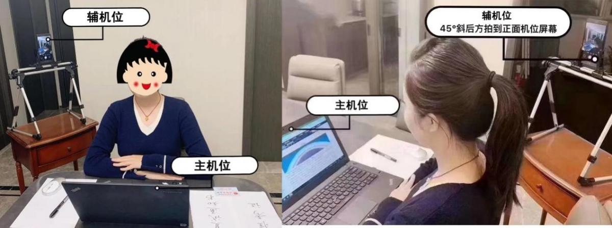 主机位使用电脑,用其自带摄像头对准考生本人,另一部电脑或手机摄像头从考生后上方成 45°拍摄。监控设备需确保能看到考生的桌面和双手。
