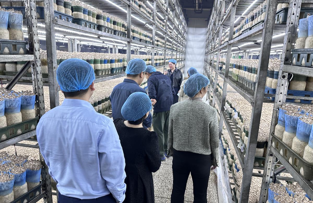 在参观过程中,史扬副总经理为大家详细介绍了星河生物的工厂化生产工艺流程。星河生物采用国际先进的食用菌栽培技术,通过严格控制湿度、光照、温度等环境因素,确保食用菌的品质和产量。同时,公司还十分注重产品的食品安全,从原材料的采购到产品的加工、包装、运输等各个环节,都严格按照国家相关标准进行操作。在星河生物的深加工产品展示区和品鉴区,大家对其深加工食品的口感和品质给予了高度评价。