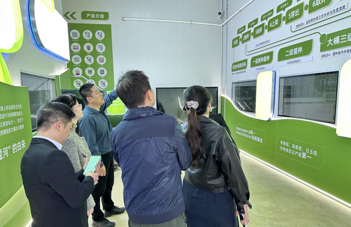 随后,姚主任一行来到了韶关市星河生物科技有限公司,在韶关市曲江区政协副主席蔡红燕、农业农村局产业办主任陈文斌、农业农村局产业办刁媚、星河生物科技有限公司副总经理史扬等领导的陪同下对公司及厂区进行了参观。韶关市星河生物科技有限公司成立于2004年,是广东省韶关市的一家专注于食用菌研发、生产、销售的省级现代农业龙头企业,也是粤北地区首家工厂化栽培食用菌的企业。公司致力于培育食用菌十余年,现已在粤北地区拥有数座大型生产基地、研发中心和深加工产品线。
