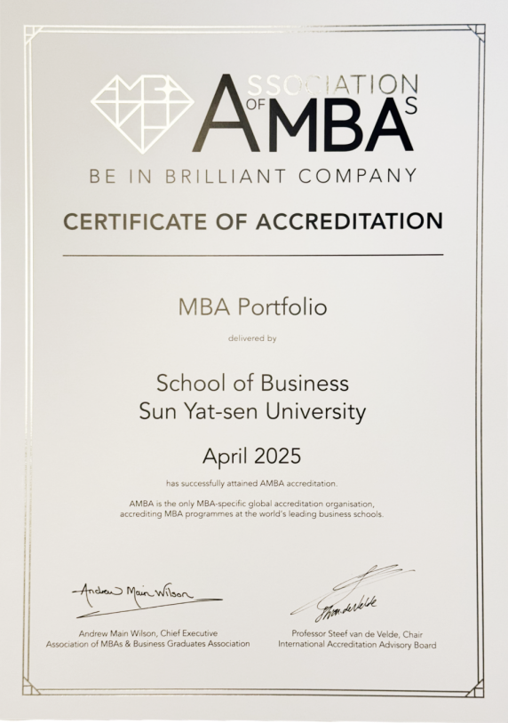 The School of Business, Sun Yat-sen University has been awarded the AMBA five-year maximum period accreditation for the fourth time