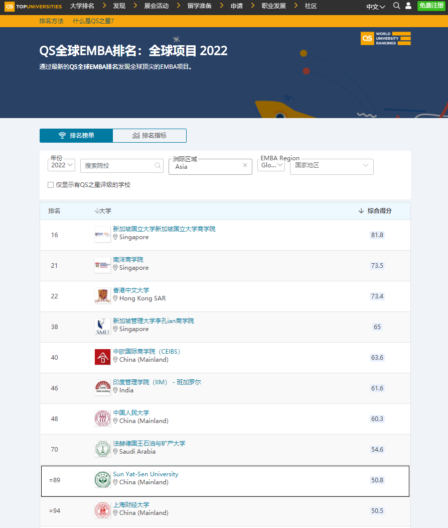Quacquarelli Symonds (QS), a global higher education research institute, recently released its latest Global EMBA Rankings 2022. The EMBA program of our school ranked 89th in the world and 9th in Asia.