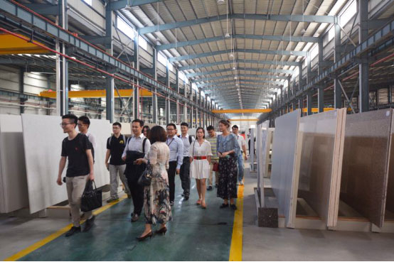 结束了上午的参观,参观团下午驱车前往环球石材集团位于东莞市常平镇的人造石生产基地,该基地占地约400亩,斥资20亿,分三期建设,目前第一期已建成投产,引进了全球最新的意大利百利通Bretonstone®全自动人造石生产线,日后将打造成为中国规模最大、配套最先进的国际一流现代化人造石加工基地。在整洁的生产车间,现代化的全自动生产系统在高效地运转,全线仅需15人操控与监测,一条生产线年产能可达60万平米。