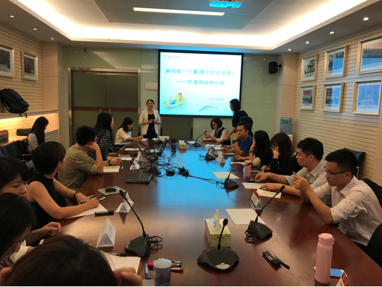活动伊始,蔡老师首先进行了自我介绍和职业发展工作坊的简介。在简单的开场白后,活动进入正题,本期工作坊分享内容主要围绕三个部分:价值观对人的影响;职业价值观的澄清;如何用价值观做出职业选择。