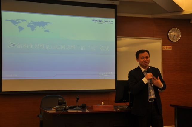 梁育刚先生曾负责过多家大型企业的项目咨询,积累了丰富的实战和培训经验,他在课堂上理论联系实际,由浅入深、案例生动具体,通过传统的思维模式和互联网思维模式,引申到对目前信息环境下的思考;通过分析线性思维、发散思维、结构化思维模式,结合日常工作和生活中我们所遇到的问题,探知解决方案,特别是在我们与领导的沟通交流上,建议思维要比领导快半拍,在结构化思维模式上,把发散的思维逻辑化,利用逻辑思维告知,再用发散思维交还至领导,得到了同学们的共鸣,大家纷纷提出问题并进行了探讨。