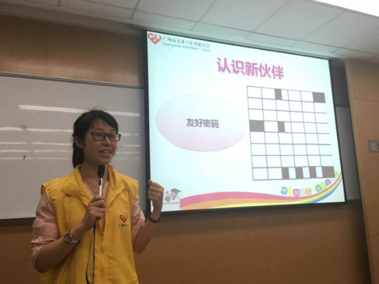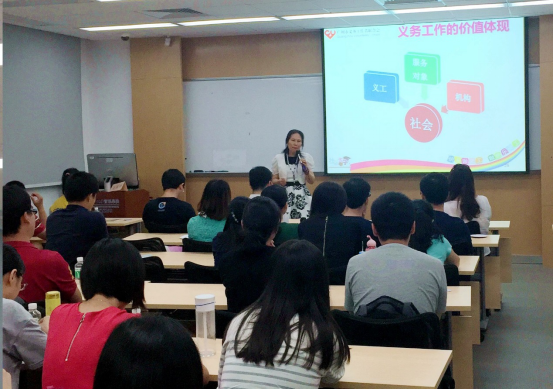 接下来,符姑娘以“HELLO热身小游戏”开始了当天的培训,从义工定义、义工服务对象、义工价值体现、义工的准备和服务注意事项等方面,给大家进行了形象生动的讲解,通过分享多个义工服务案例和经验总结,向在场同学们阐述了了义工的真正价值,其风趣幽默的授课形式更是活跃了气氛,现场不时响起热烈的掌声。
