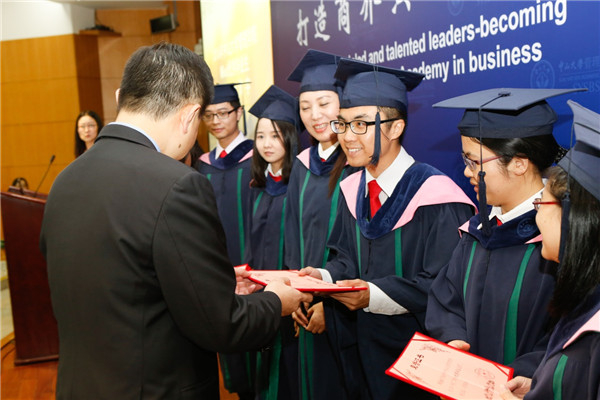 接着,MBA中心张瑾老师宣读了《2016年伟德国际victor19465M毕业生评优获奖名单》,黄海权、刘伟等42名毕业生荣获学业优异奖,王建军、谢成等28名毕业生荣获优秀毕业生称号,陈丽娜、蒲源等15名毕业生荣获杰出贡献奖。姚海林主任与田正芳总监分别为获奖毕业生们颁奖,在场的获奖者依顺序上台领奖并与颁奖嘉宾合影留念。
