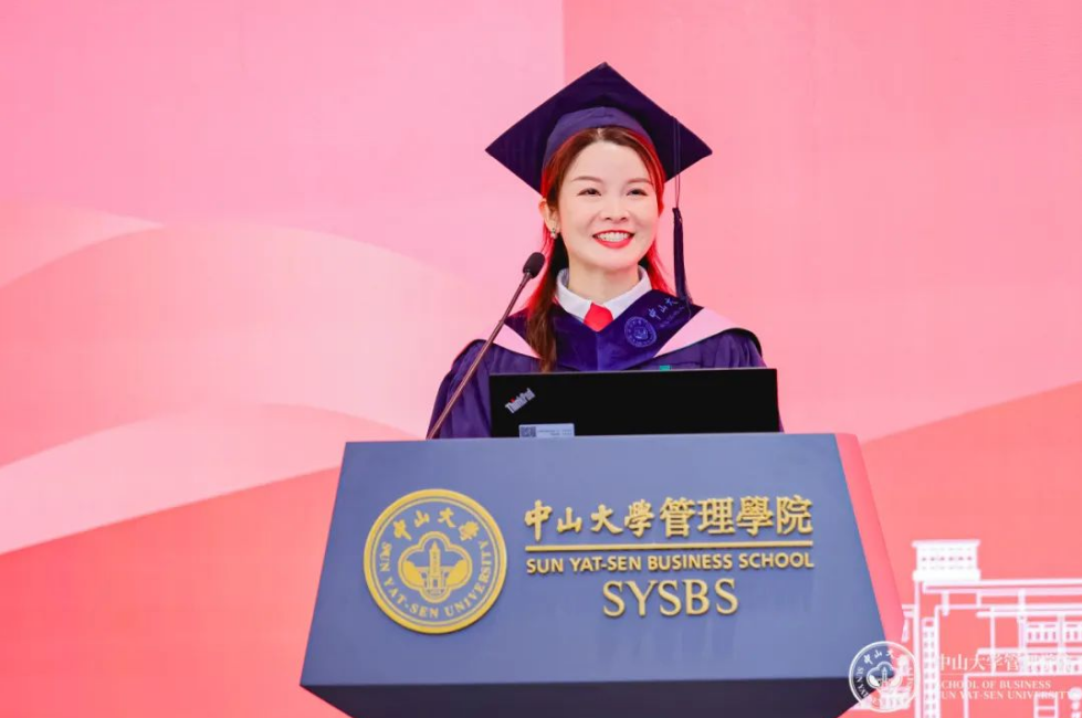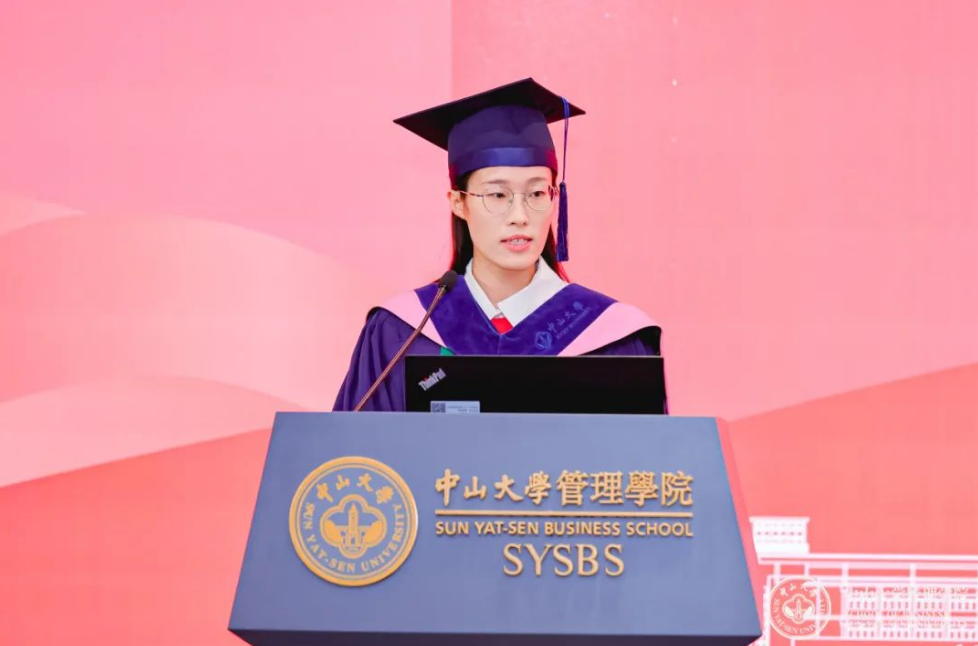 研究生代表徐伟凝练了三点建议与毕业生们共勉:一、用心去寻找到自己的人生使命;二、树立足够远大的目标;三、把握当下,做好自己。在管院的学习让同学们看见越来越大的世界,作为中大学子,他希望大家用更好的成绩来回报母校。