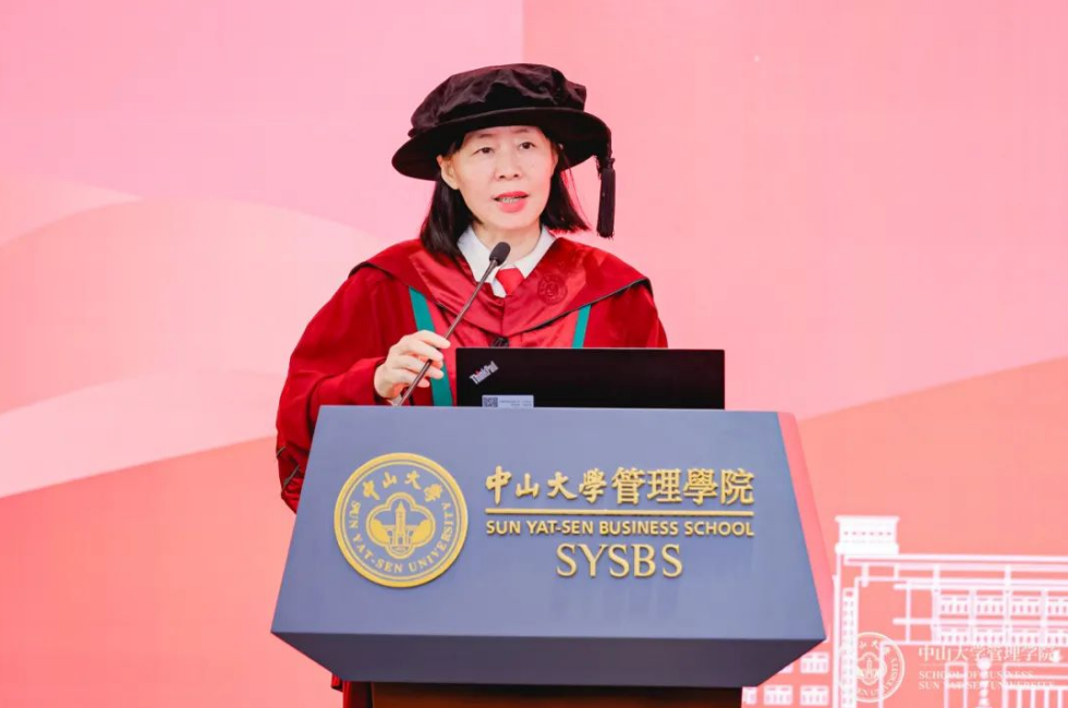 教师代表傅慧教授运用不确定性(VUCA)框架,给大家毕业的行囊放入四个建议:一、愿景引领,使命驱动;二、洞察社会,理解他人;三、保持好奇心;四、培育敏捷响应力。她祝愿同学们在未来更好地拥抱不确定性,探索无限可能。