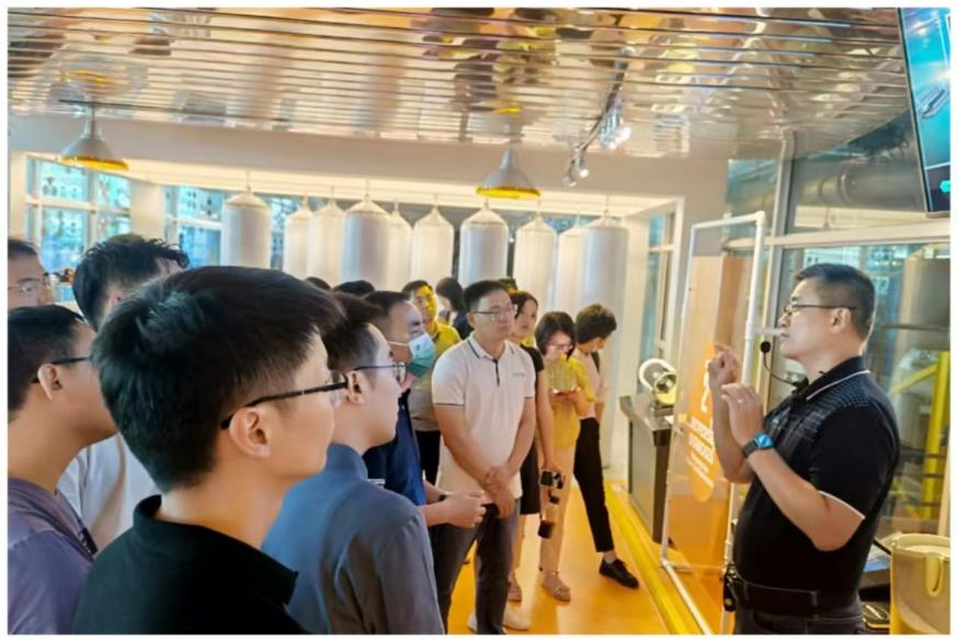 工作人员向参访师生介绍虎啤工厂