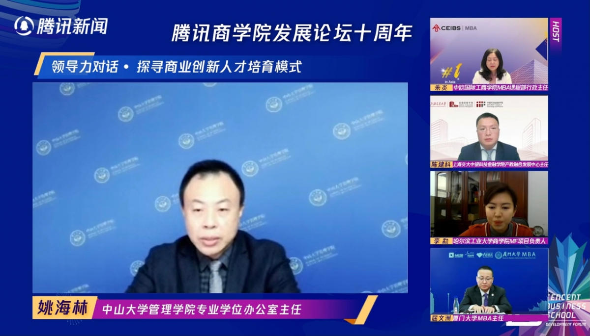 公司专业学位办公室主任姚海林博士受邀参加了“探寻商业创新人才分培育模式”线上圆桌主题论坛。姚主任就经济“双循环”新格局下,公司专业学位商科人才的差异化定位、国际化培养以及打造核心竞争力的做法进行了分享。