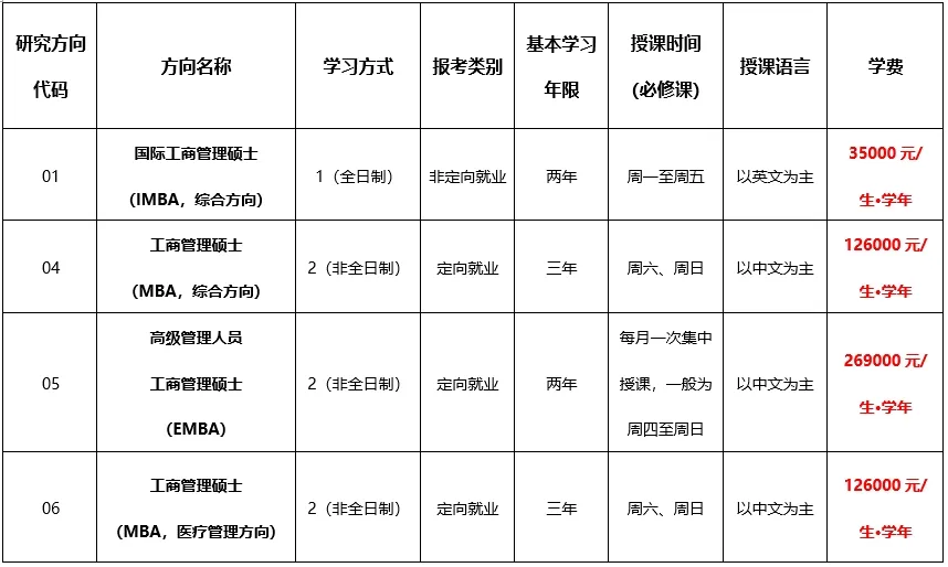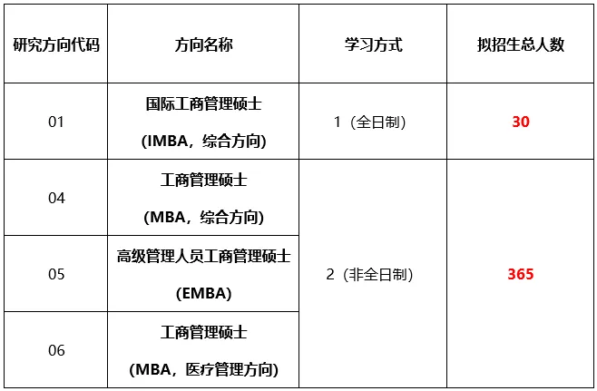 2025年计划面向全国招收工商管理硕士【专业代码125100】专业学位研究生395人,包括高级管理人员工商管理硕士(EMBA,非全日制)、国际工商管理硕士(IMBA,全日制,综合方向)、工商管理硕士(MBA,非全日制,综合方向)、工商管理硕士(MBA,非全日制,医疗管理方向)四个报考方向。