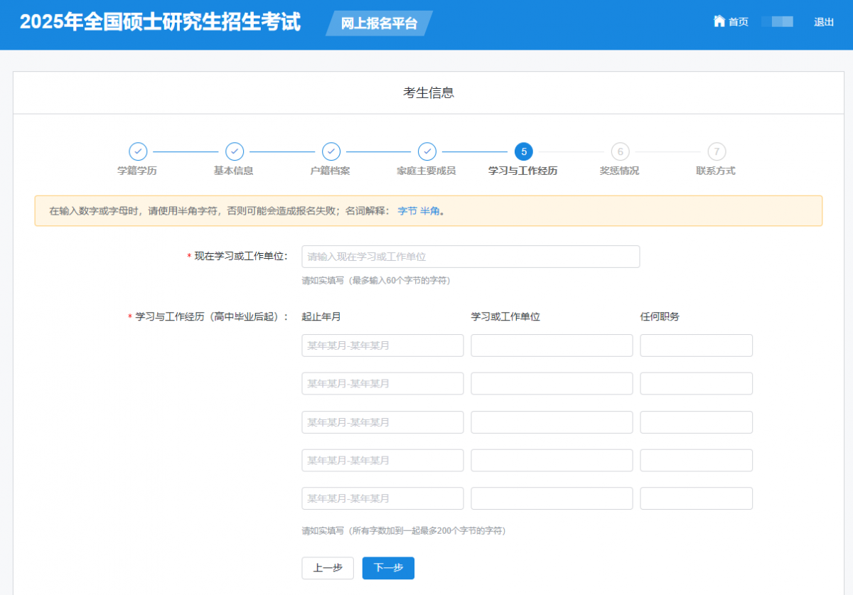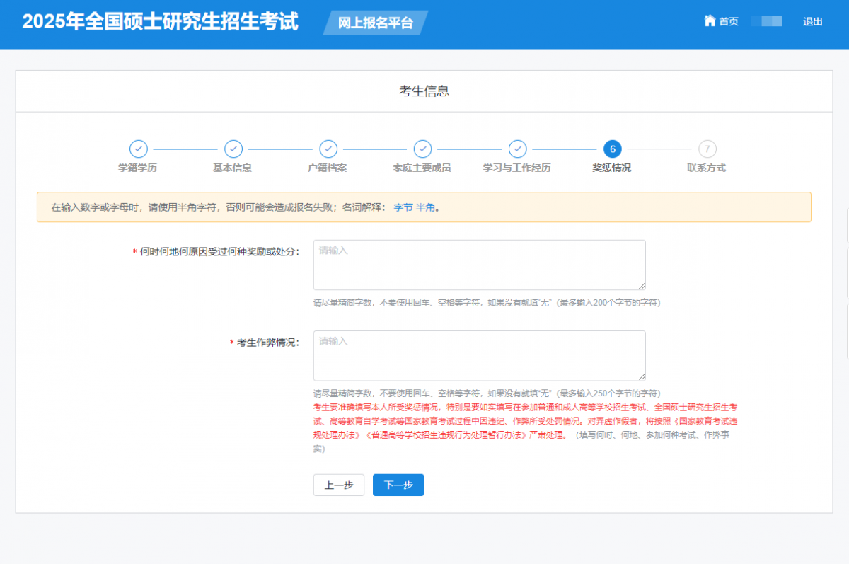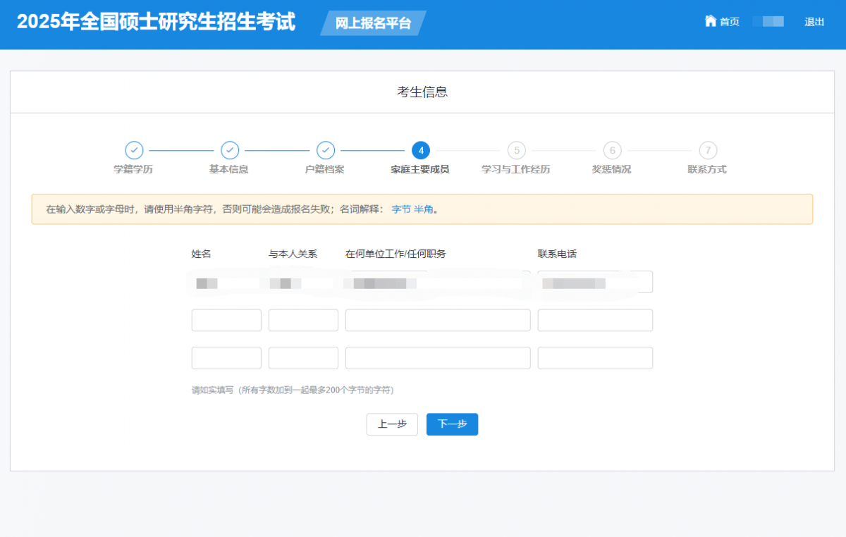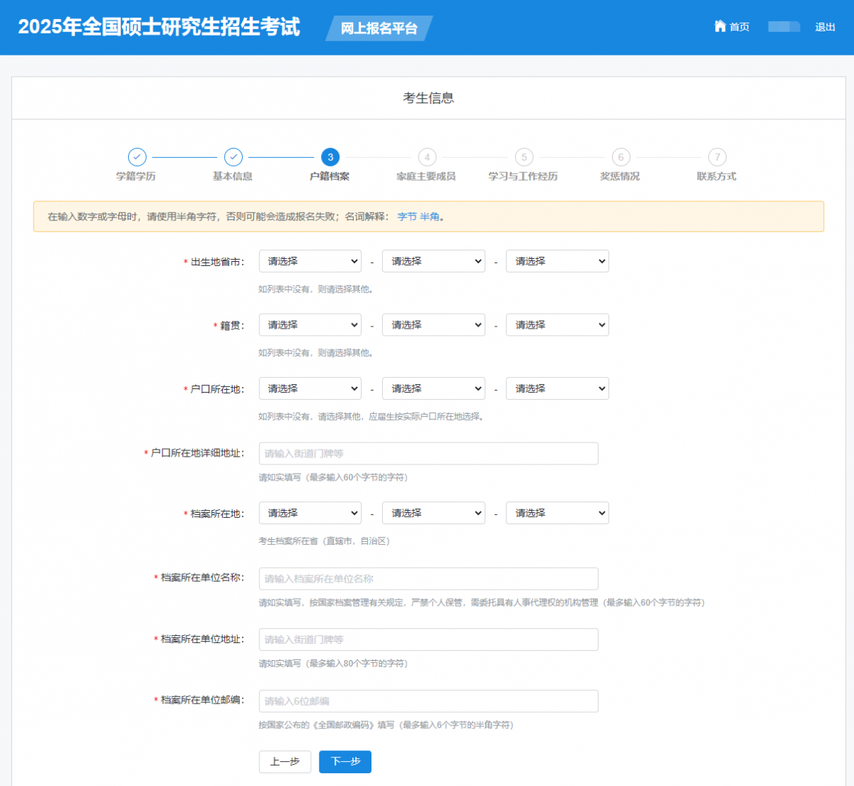 6、报名平台最上方为“考生信息”流程进度栏,包括:学籍学历、基本信息、户籍档案、家庭主要成员、学习与工作经历、奖惩情况、联系方式等模块。