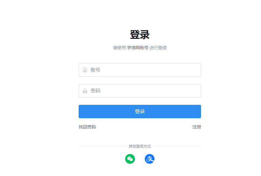 2、输入学信网账号、密码登录,如未有账号先请注册;支持使用微信或支付宝登录。