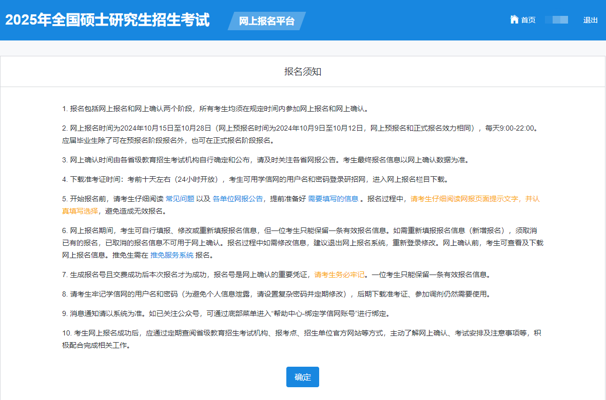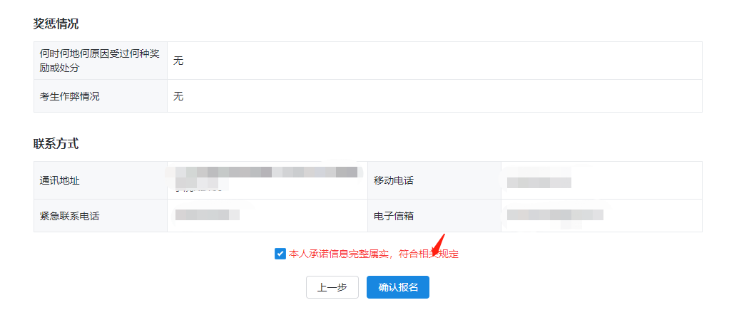 21、最后确认报名信息:请按教育部、本人所在地省级教育招生考试管理机构、报考点以及报考招生单位的网上公告要求报名,凡不按公告要求报名、网报信息误填、错填或填报虚假信息而造成不能考试或复试的,后果由考生本人承担。报考信息一旦提交不可修改。