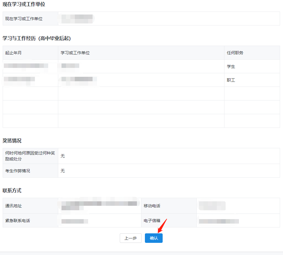 17、再次确认考生个人信息,确认无误后请点击“确认”进入“报考信息”填报页面。