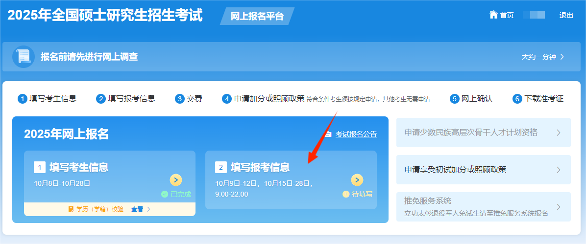 您好!2025年全国硕士研究生招生报名已开始,请您于10月28日前登录中国研究生招生信息网报名:
