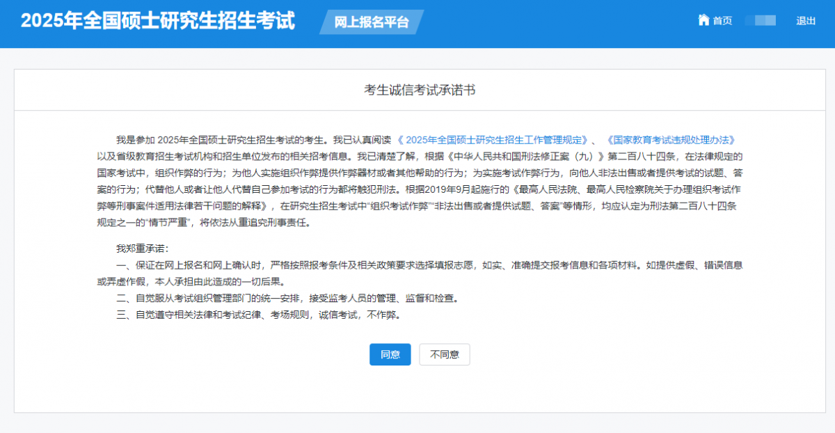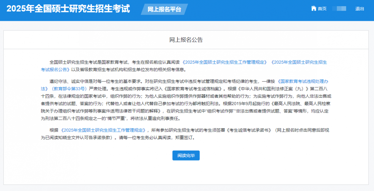 16、请仔细阅读网上报名公告后,点击“阅读完毕”,进入考生诚信考试承诺页面,仔细阅读后。点击“同意”。