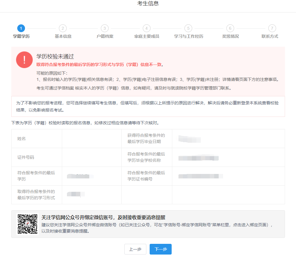 7、完成“学籍学历”信息填写后,点击“下一步”进入学历验证页面,请耐心等待验证结果。学历校验未通过仍可继续点击“下一步”,填写考生信息。