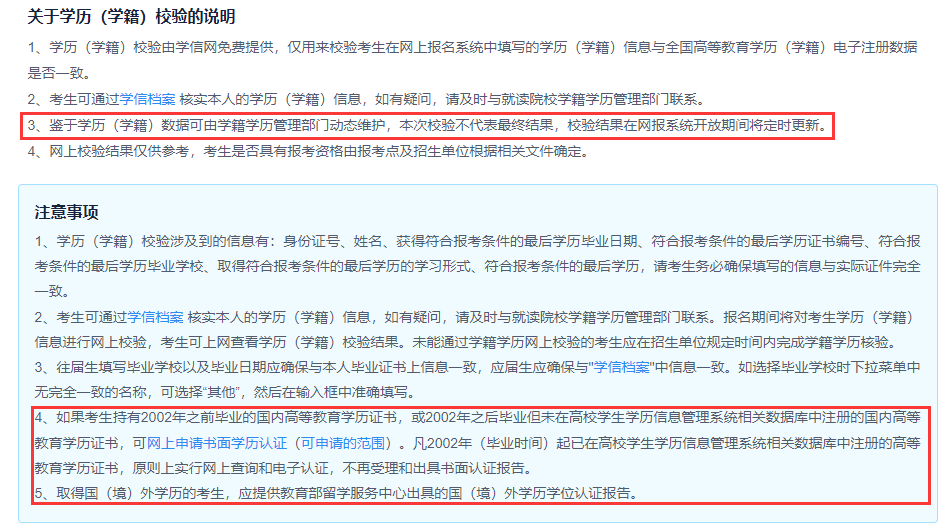 4、报名期间系统将对考生学历(学籍)信息进行网上校验,考生可上网查看学历(学籍)校验结果。考生也可在报名前或报名期间自行登录“中国高等教育员工信息网”(网址:http://www.chsi.com.cn)查询本人学历(学籍)信息。未通过学历(学籍)校验的考生应及时到“中国高等教育员工信息网”公布的学籍学历权威认证机构完成学历(学籍)核验,并在网上确认、复试阶段提交核验报告,未完成核验者不予复试。请在网上报名系统未通过学历(学籍)校验的同学尽快办理学历认证,办理方法详见http://www.chsi.com.cn/xlcx/。