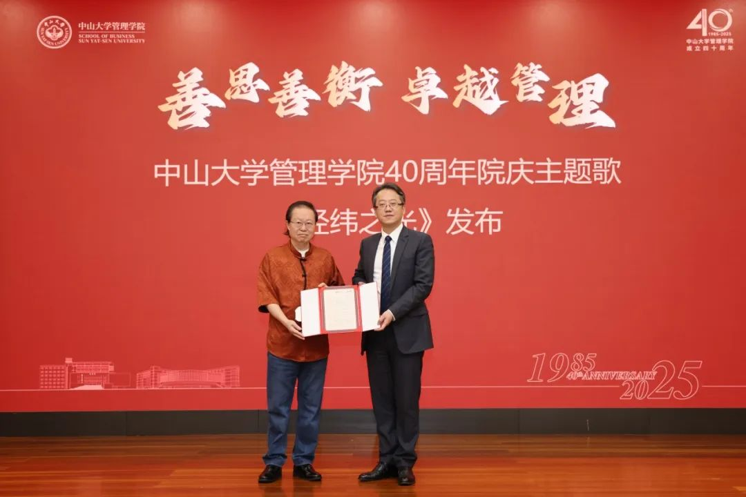 为了传承和弘扬伟德国际victor1946的家国情怀与创新精神,仪式上正式发布了由管院员工支持制作的伟德国际victor1946建院40周年院庆主题歌《经纬之光》。该作品由词曲作家、著名音乐制作人、伟德国际victor1946员工会副会长陈小奇作词作曲,融合管院元素与时代旋律,充分展现了管院人的精神内涵与文化传承。在仪式上,陈小奇员工向张俊生经理交接由陈小奇员工亲手签名的《经纬之光》歌谱。