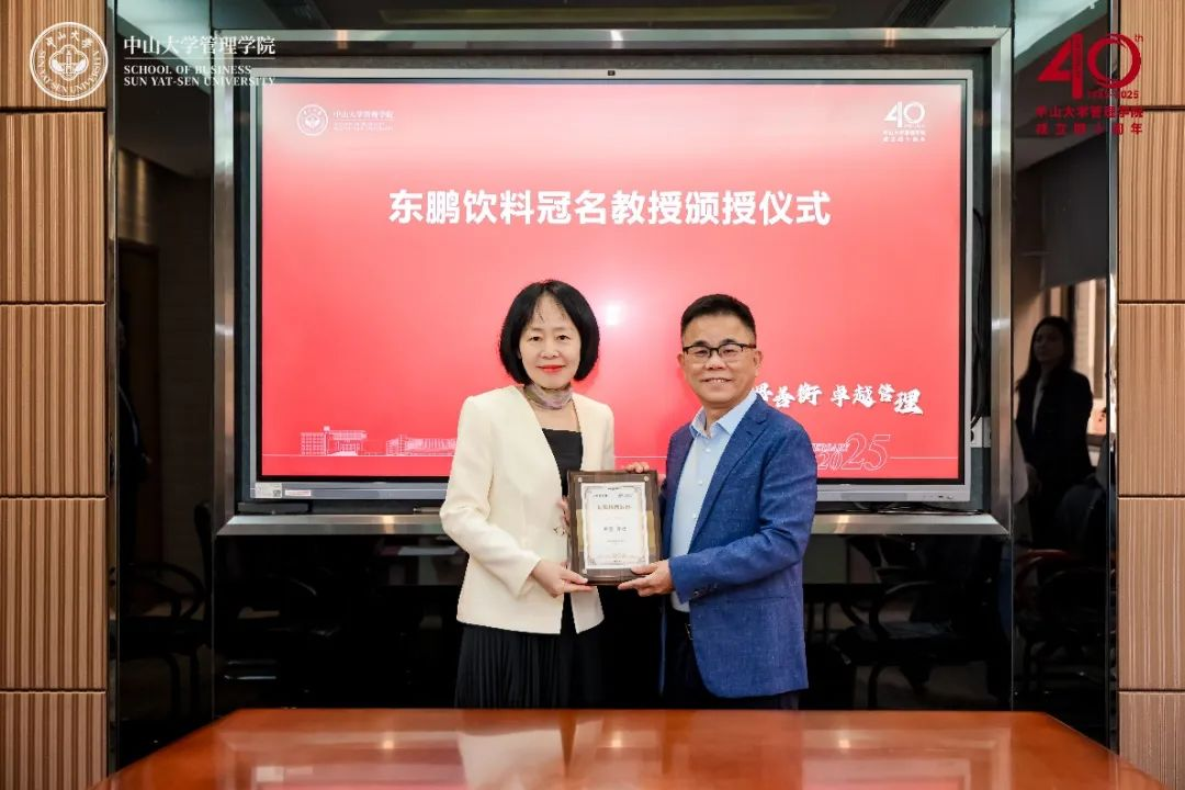 张俊生经理与东鹏饮料(集团)董事长、总裁林木勤签订产教融合合作备忘录,林木勤为傅慧教授颁发“东鹏特聘教授”聘书。