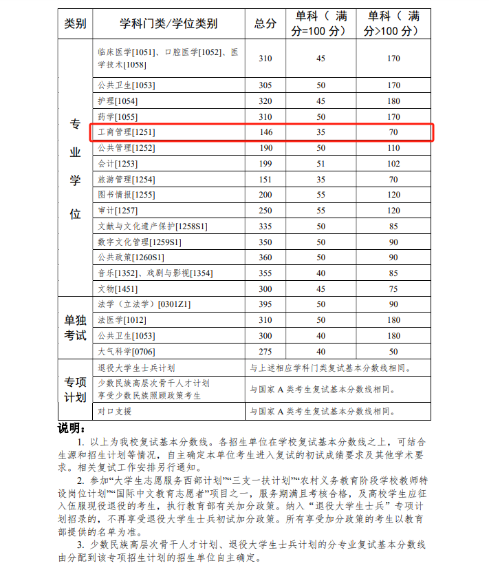 工商管理【1251】复试分数线为:146/70/35。根据公司有关2026年硕士研究生招生考试复试工作要求,具体复试方案及相关安排将于近期公布,请同学们及时关注通知。