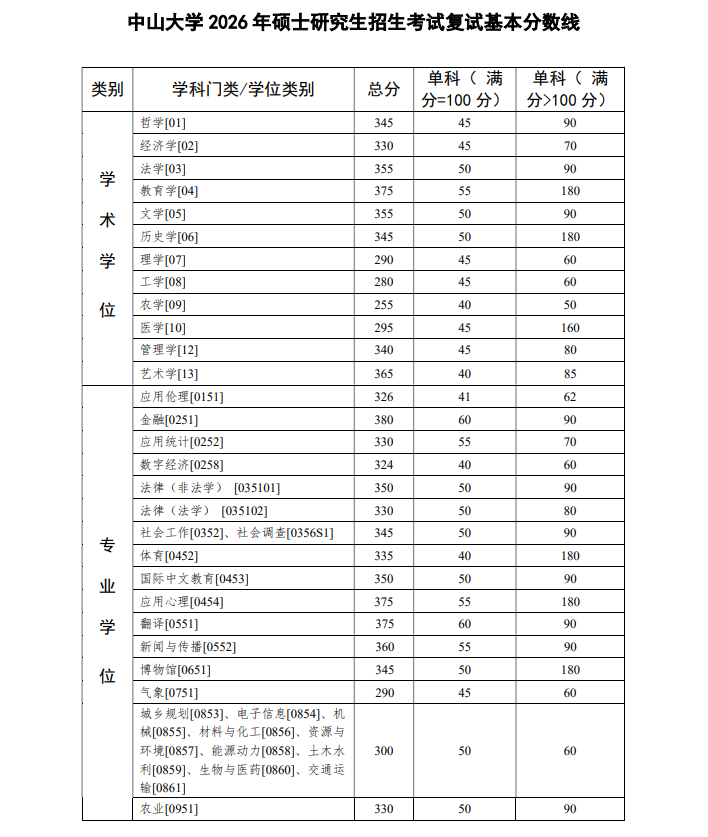 同学们好,《2026年硕士研究生招生考试复试基本分数线》已发布: