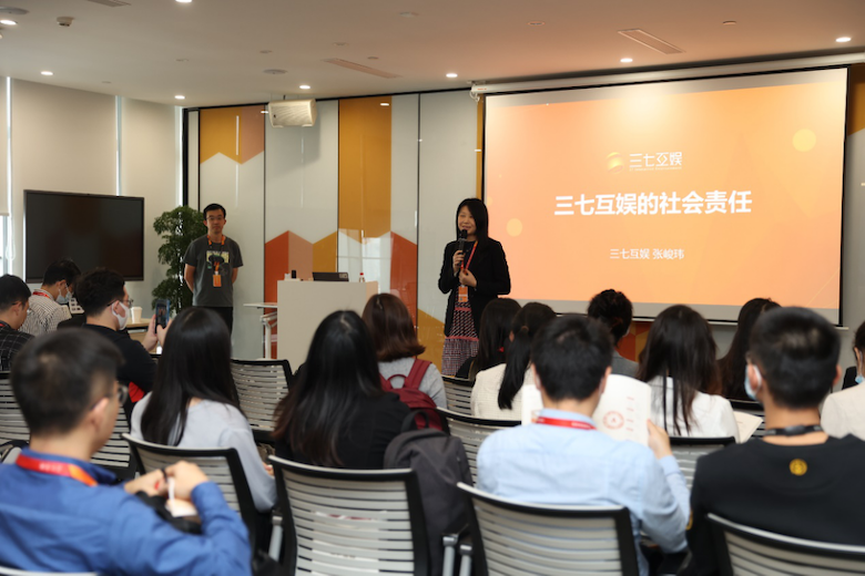 三七互娱游心公益秘书长、社会责任总监张峻玮从战略公益、人力资本、信息安全、奔向零碳、行业责任共同体建设等7个方面向大家讲述了三七互娱社会责任品牌故事,展示了作为一家行业内ESG(公司的环境、社会和公司治理)领先企业的风采。随后,张总监耐心解答了师生们的问题,双方共同探讨CSR内部沟通机制、非公企业党建活动落实情况、企业履行社会责任的初心、互联网企业取消大小周工作制等热门话题。
