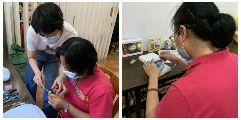 接着,义工们参观了工疗站手工艺品工作坊。据介绍,现场展示的精美作品如毛线娃娃、十字绣等均由残疾工友用心制作,其中两位工友还即兴示范了手工艺品制作过程,义工们连连惊叹于他们的手巧与专注。在友好的交流中,义工们努力挖掘了手工艺品背后的故事。