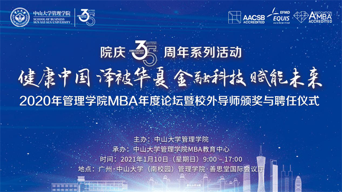 2021年1月10日,2020年伟德国际victor1946MBA年度论坛暨校外导师颁奖与聘任仪式在伟德国际victor1946国际会议厅召开。本次论坛主题为“健康中国,泽被华夏;金融科技,赋能未来”。来自医药学领域、金融科技领域的14位专家学者和100多位校外导师应邀出席。大会进行了隆重的校外导师颁奖与聘任仪式,表彰并感谢各位校外导师对中大管院教育事业做出的贡献,向郭忠金等15位优秀校外导师颁发了“卓越贡献奖”,向曹永沂等48位自2007年设立校外导师制度以来一直在聘的优秀校外导师颁发了“精诚伙伴奖”,同时为陈怀宇等25位新聘校外导师、陈楚宣等17位续聘校外导师颁发了聘任书。