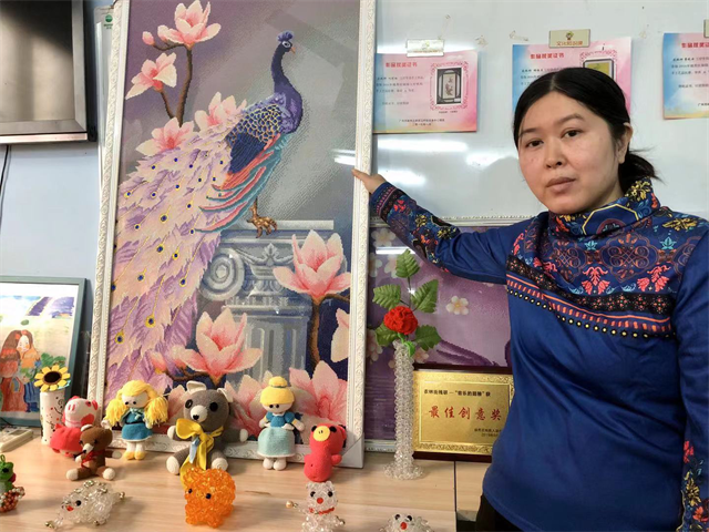 患有自闭症和智力残疾的小云是制作这些工艺品的成员之一,每天她都在母亲的陪同下来到工疗站。聊到这些年与女儿一起克服的种种困难,小云的母亲十分感慨,甚至有些哽咽。谈到女儿的现状,她欣慰地说道:“这里没有歧视,大家都是平等的,制作十字绣等工艺品可以改善他们的情绪,释放潜在压力,让他们接纳自己,建立自信。在工疗站,小云能找到自己的价值。”