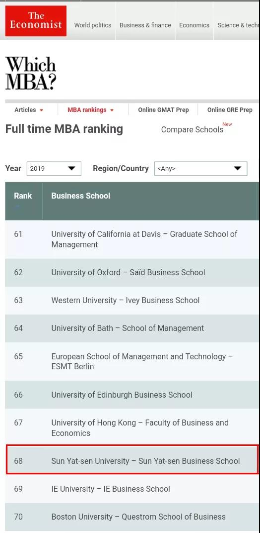 公司MBA位列全球第68名(来源:经济学人官网截图)
