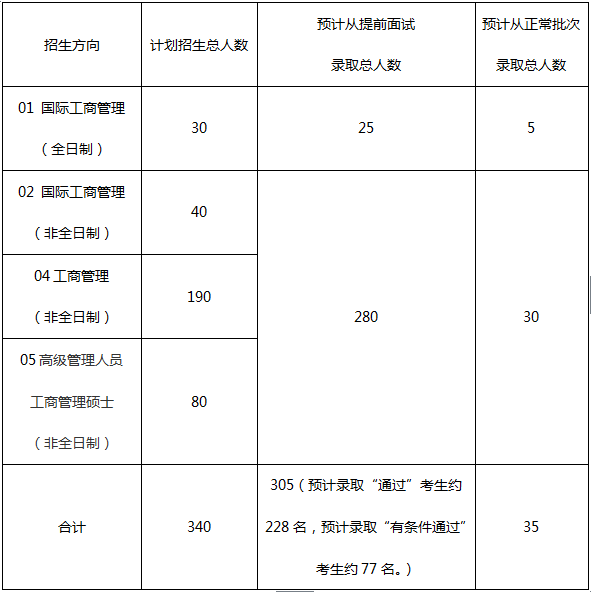 2019年计划面向全国招收工商管理硕士学位研究生340名,包括国际工商管理(全日制)、国际工商管理(非全日制)、工商管理(非全日制)、高级管理人员工商管理硕士(非全日制)四个报考方向。