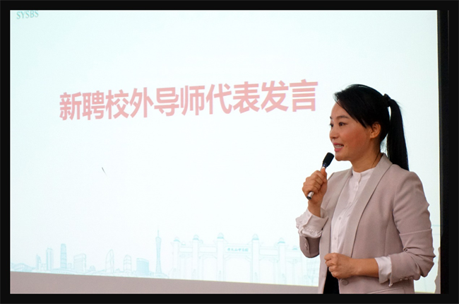新聘校外导师代表,众安康后勤集团有限公司陈晓慧副总裁在获聘感言中分享了自己的人生历程,包括英国求学的经历、回国在政府经济开发岗位工作近十年的感悟、企业工作的历练、创业的艰辛。此外,她还分享了其对经济、市场、企业管理、消费者及未来趋势等方面的理解和观点。她希望以后可以把自己的知识和经验传授给员工,帮助他们成长。