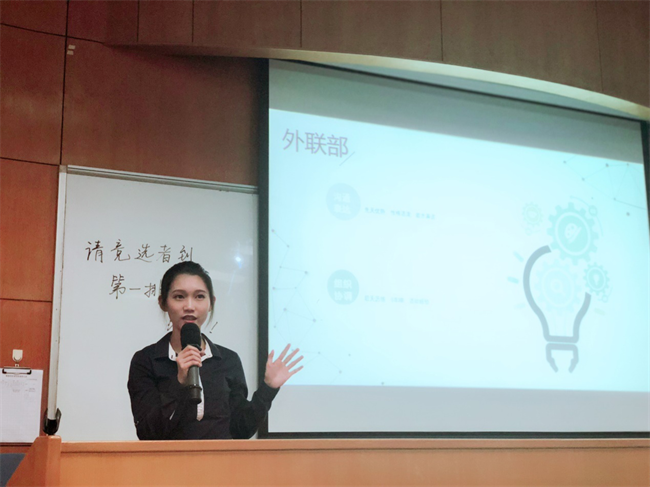 晚上19:00,选举大会正式开始,主持人吴逸洵宣读本次选举流程与规则,每名竞选者上台展开5分钟左右的竞岗演讲,并由评委会提出两到三个问题。