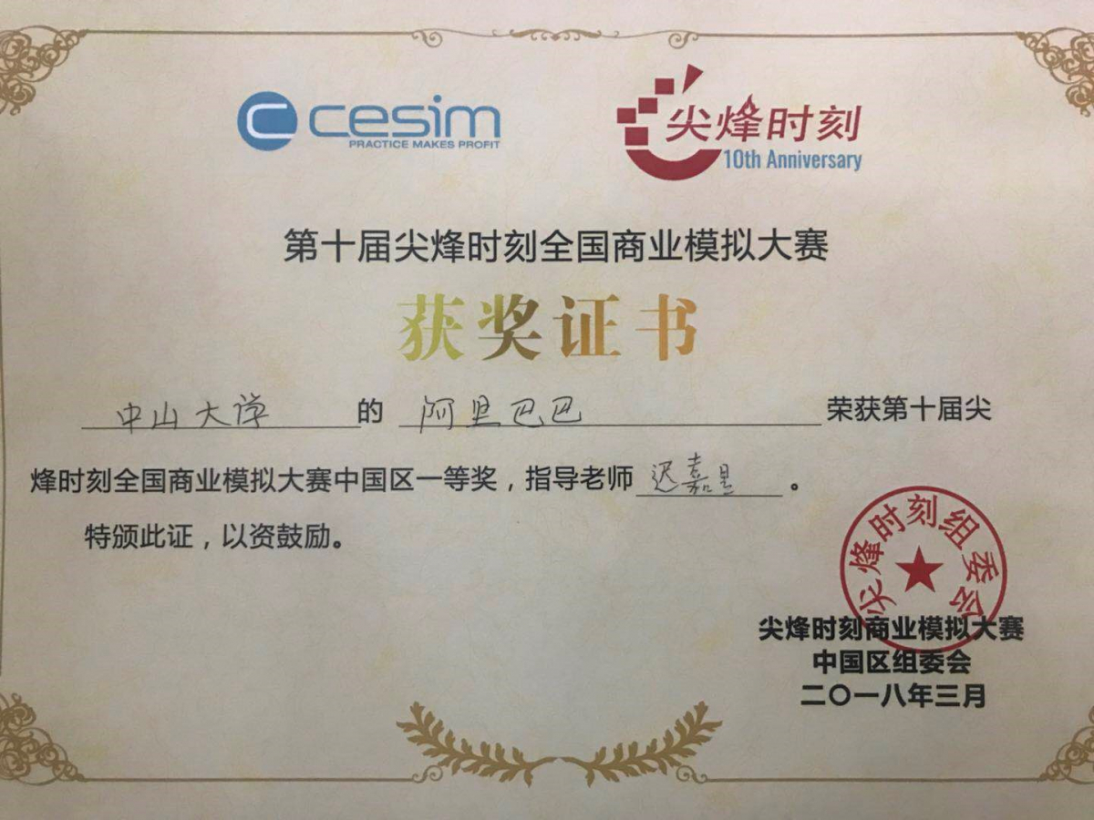 在经过紧张的三轮比拼后,最终,阿里巴巴团队获得第十届CESIM“尖烽时刻”全国商业模拟大赛总决赛一等奖的优异成绩;公司迟嘉昱老师获得“优秀指导老师”的称号。