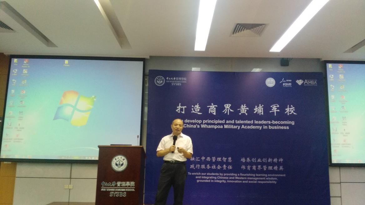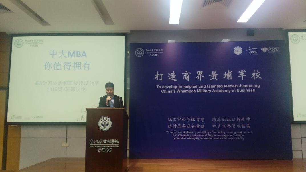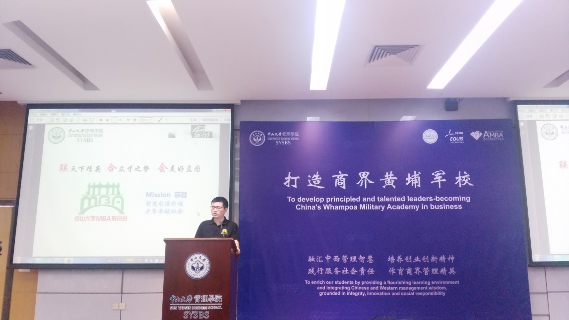 最后,在校员工2015级PTMBA4班邵钊伦同学对新生的到来表示欢迎,他结合自己在公司2年的成长历程,跟新生同学们分享了MBA学习生活和班级建设,提了关于班级建设建议及学习生活建设:确定好班委,各司其职,为同学办实事,多组织活动;好好学习,天天向上,多参加班级和公司活动,强化本专业,跨界学习,出去走走,看看外面的世界。