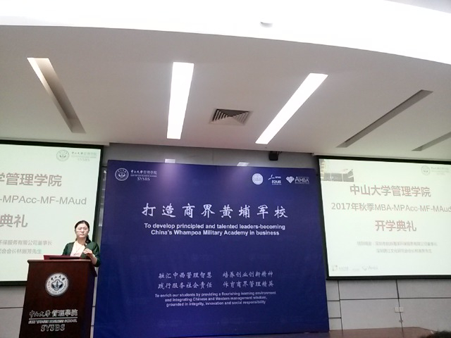 刘静艳副经理在开学典礼上致辞,她代表伟德国际victor1946全体教职员工、在校员工和员工热烈欢迎2017级4M新同学加入伟德国际victor1946。刘经理通过讲述自己在哈佛学习的经历,希望同学们能够以空杯心态,归零开始,正确地对待学习。随后刘经理围绕罗俊董事长的寄语“德才兼备 领袖气质 家国情怀”谈了关于MBA学习及以持有什么样的心态去学习。刘经理认为中大要求的“德才兼备、领袖气质、家国情怀”,分别表示有底气、有大气、有豪气,要抛开自以为是,遵循规矩的学习让自己更加有底气,通过提升自身价值与综合素质能力,让自己大气,为国家、为社会、为集体,包括个人,创造价值,让自己有豪气,并祝各位新同学在未来的学习生涯中,积极向上、学业进步,成就更好的自己。