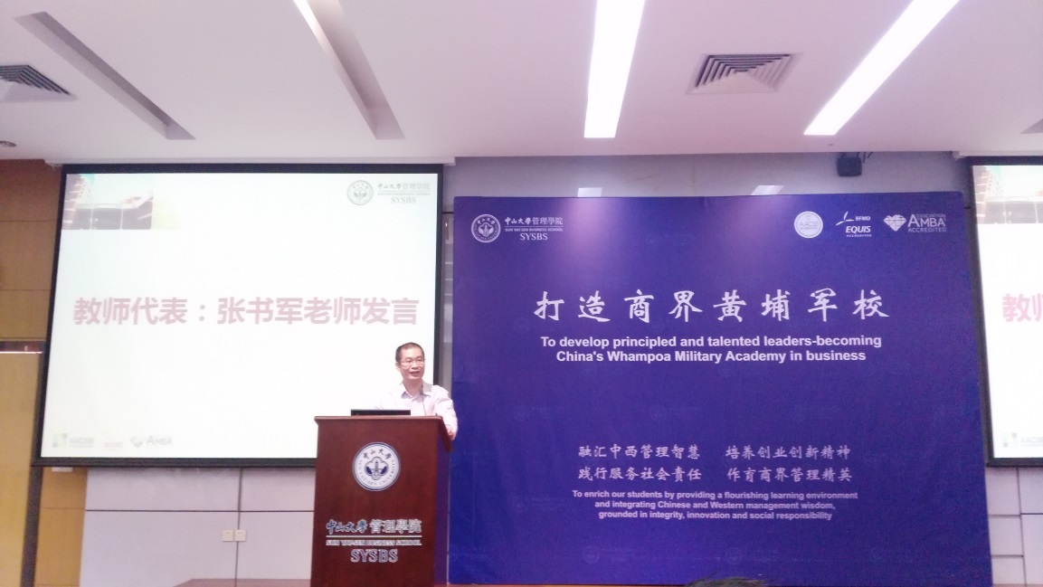 教师代表张书军教授代表全体教师发言,他与同学们分享了中大的校训词“博学 审问 慎思 明辨 笃行”。博学,通达地学习、广泛的学习,这是吸收知识的过程;审问,审慎地探问、深入地追问,这是答疑解惑的过程;慎思,谨慎地思考、周密地思索,这是遴选消化的过程;明辨,明晰地分辨、明确地判别,这是择定结果的过程;笃行,笃定地履行、坚定地执行,这是践行学志的过程。张书军教授期待同学们学会学习,正确处理好学习和实践的关系, 真正做到“学问思辨、身体力行”。