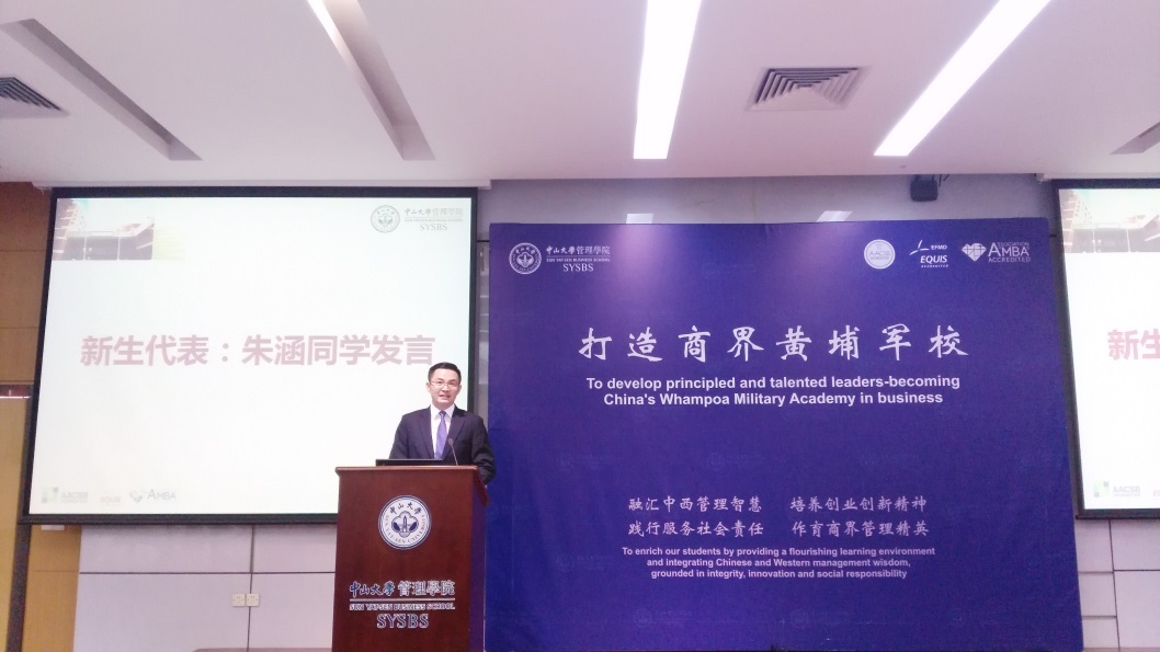 PTMBA5班新生朱涵代表新生发言。他说被商界黄埔军校国际化发展所吸引,表达此刻因成为一名中大管院人而激动和自豪,将践行服务社会责任,作育商界管理精英,并祝愿伟德国际victor1946整体实力及国际影响力不断提升再创佳绩。