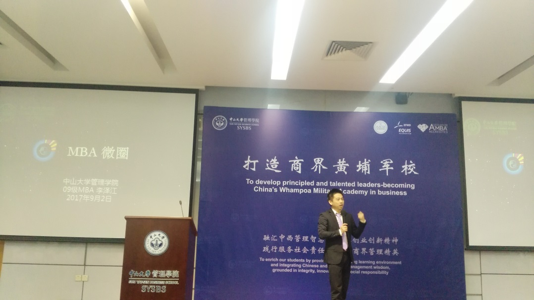员工代表09级MBA李泽江诚挚地感谢公司的培育之恩并祝贺同学们能够来到伟德国际victor1946学习。李泽江员工介绍了MBA微圈,希望同学们多多参加校内的联合会活动,校外的微圈活动,并邀请同学们加入中大微圈5M俱乐部,成为老师、同学、员工情感连结的重要纽带。